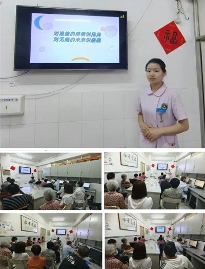 護(hù)士長(zhǎng)馬運(yùn)俠以播放癌痛科普視頻的方式,通過臨床疼痛案例深入淺出地將癌痛防治知識(shí)分享給大家,現(xiàn)場(chǎng)與患者進(jìn)行了“話療”,消除他們的緊張情緒,幫助他們樹立抗擊癌痛的信心,科學(xué)的防癌抗癌,受到患者及家屬的一致好評(píng)。