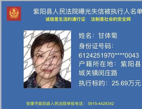 被執(zhí)行人甘體菊,你因不履行(2017)陜0924民初241號民事判決書確定的義務(wù),已被紫陽縣人民法院納入失信被執(zhí)行人名單庫依法進行信用懲戒。信用懲戒范圍包括但不限于以下措施: