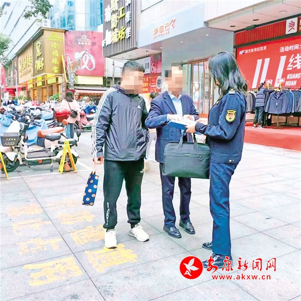 11月6日,漢濱區(qū)城管執(zhí)法人員在金州路開展糾治隨地吐痰專項(xiàng)執(zhí)法,對(duì)隨地吐痰人員提示改正,并根據(jù)相關(guān)規(guī)定進(jìn)行處罰。市創(chuàng)文辦供圖……