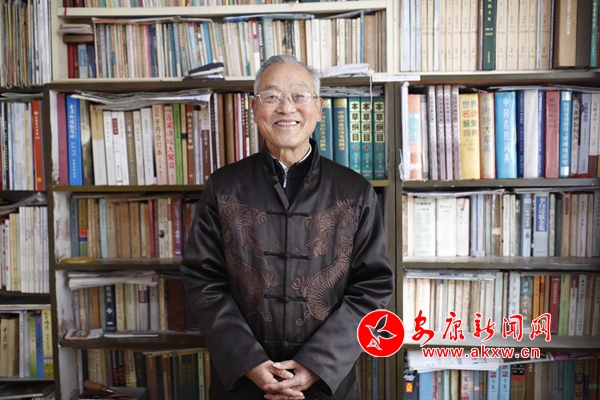 他的家在一樓,春日陽光把屋里曬的暖暖,兩面墻的萬卷藏書讓人一進(jìn)門就覺得徜徉于典籍的海洋。郭老緩緩坐在靠窗的凳子上,用一只手用力按住強(qiáng)烈抖動的另一只手,娓娓道來。