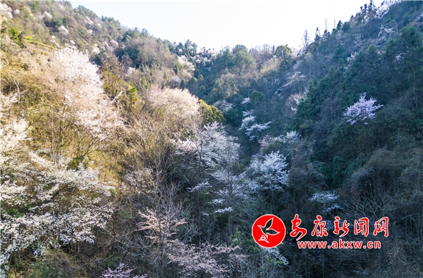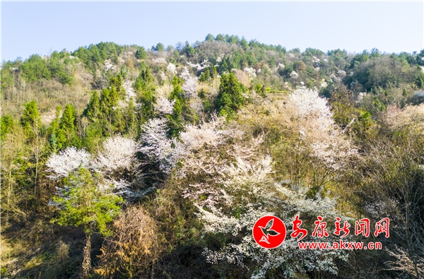本網(wǎng)訊(記者 李俊 實習記者 卜昊天)近日,漢濱區(qū)晏壩鎮(zhèn)漫山的野生櫻桃花在和煦的春風中競相盛開。遠眺山林,從山腳到山頂次第綻放,山澗幽谷處處粉白,民居藏于其中,宛若世外桃源,起伏的山脈被一簇簇壓滿整個枝頭的櫻桃花所覆蓋。