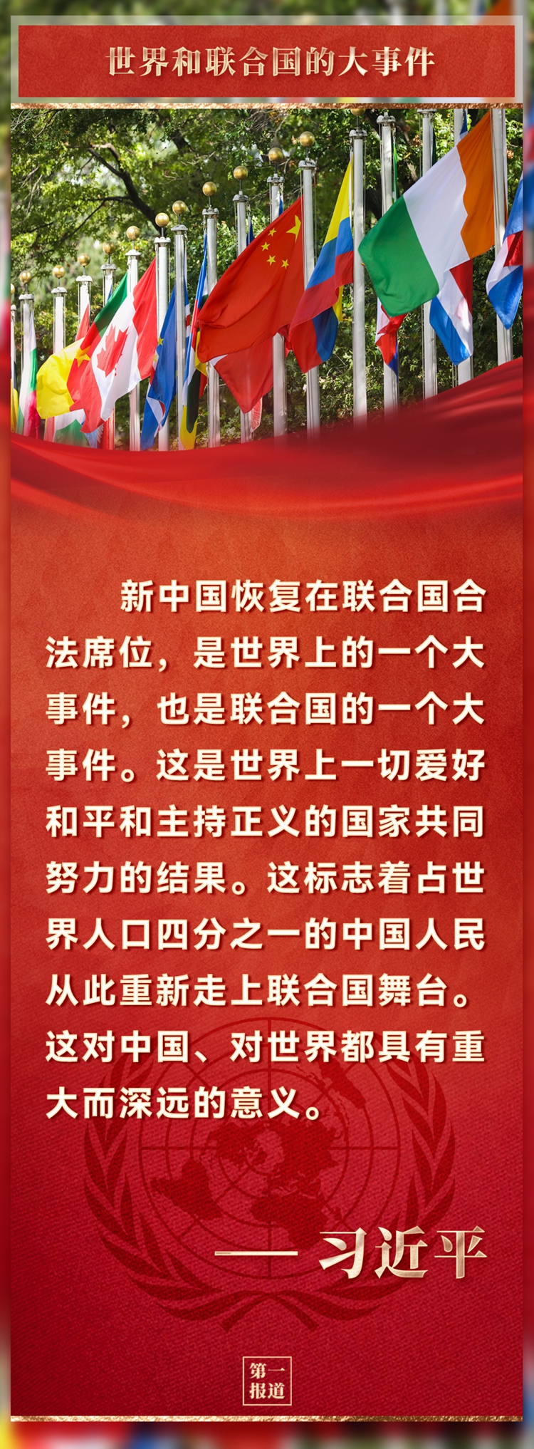 新中國恢復在聯(lián)合國合法席位,是世界上的一個大事件,也是聯(lián)合國的一個大事件。這是世界上一切愛好和平和主持正義的國家共同努力的結果。這標志著占世界人口四分之一的中國人民從此重新走上聯(lián)合國舞臺。這對中國、對世界都具有重大而深遠的意義。
