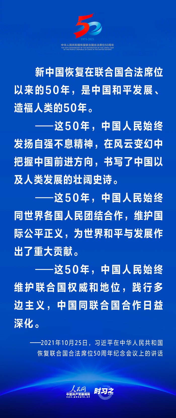 10月25日,國家主席習(xí)近平在北京出席中華人民共和國恢復(fù)聯(lián)合國合法席位50周年紀(jì)念會(huì)議并發(fā)表重要講話。在講話中,習(xí)近平回顧了中華人民共和國恢復(fù)在聯(lián)合國合法席位50年以來的重大成就,面對(duì)百年未有之大變局,重申中國將始終做世界和平的建設(shè)者、全球發(fā)展的貢獻(xiàn)者和國際秩序的維護(hù)者。 WTT安康新聞網(wǎng)