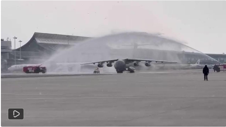 11時(shí)30分許,飛機(jī)抵達(dá)遼寧沈陽(yáng),長(zhǎng)眠異鄉(xiāng)七十余載的英烈回到祖國(guó)。隨后,飛機(jī)緩緩?fù)ㄟ^(guò)象征著最高禮遇的“水門”。