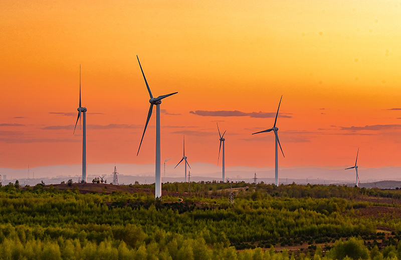 2023年5月23日清晨拍攝的內(nèi)蒙古興安盟烏蘭浩特市呼和馬場風力光伏發(fā)電場內(nèi)的風機。