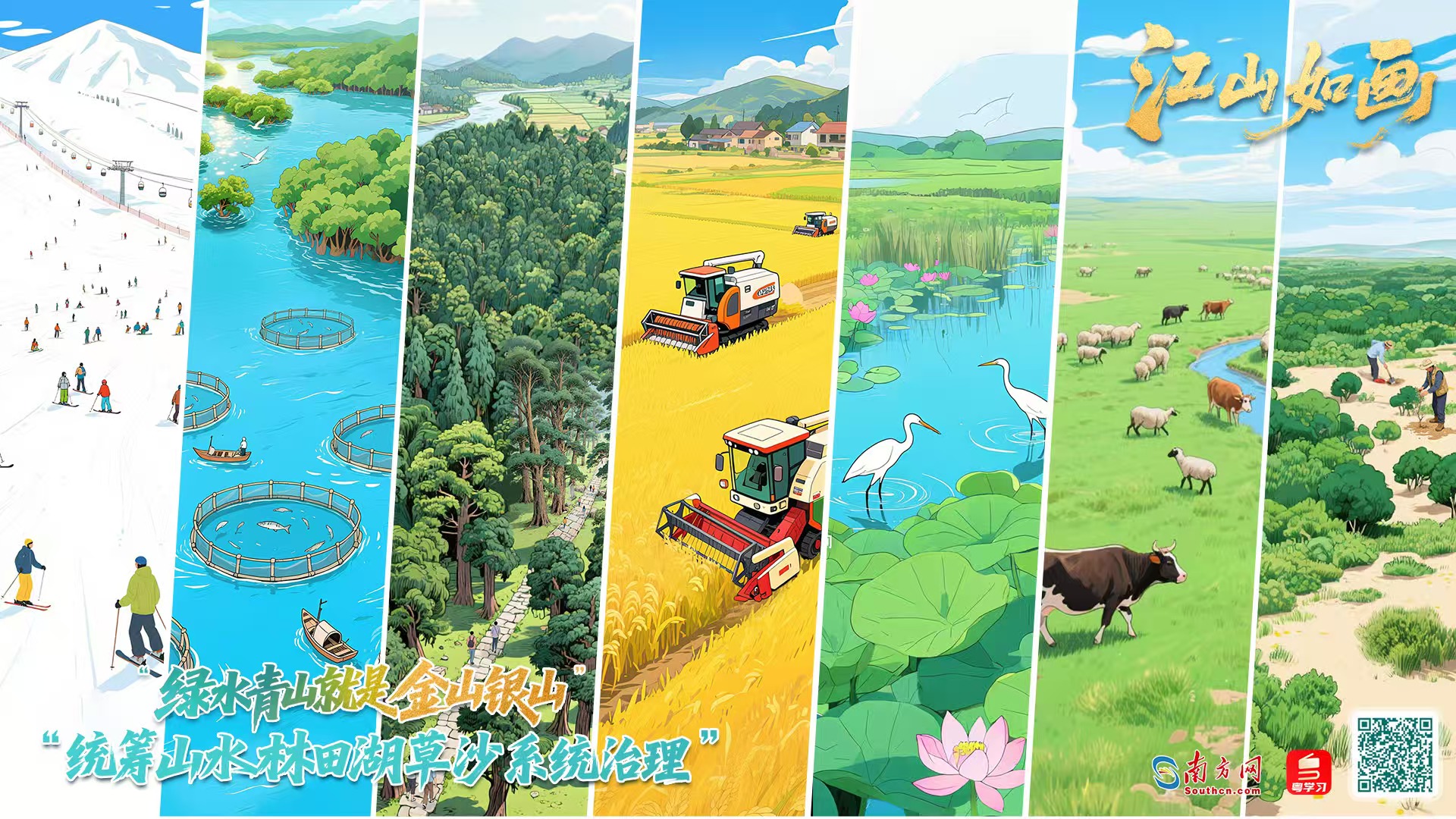 從20年前的余村到現(xiàn)在的中國大地,從“山水林田湖是一個生命共同體”到“統(tǒng)籌山水林田湖草沙系統(tǒng)治理”,從海拔0米的南海之濱到4000多米高的世界屋脊,幅員遼闊、高低起伏的中國大地上,綠色發(fā)展的藍圖漸次鋪展,美麗中國的畫卷逐筆繪就。