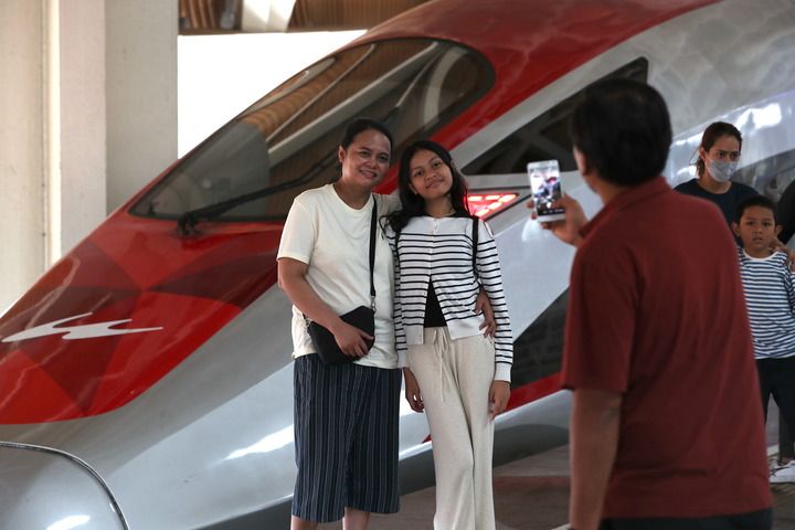 6月19日,在印度尼西亞雅加達(dá)哈利姆站站臺(tái),兩名乘客與雅萬(wàn)高鐵高速動(dòng)車組列車合影。 新華社記者 岑云鵬 攝