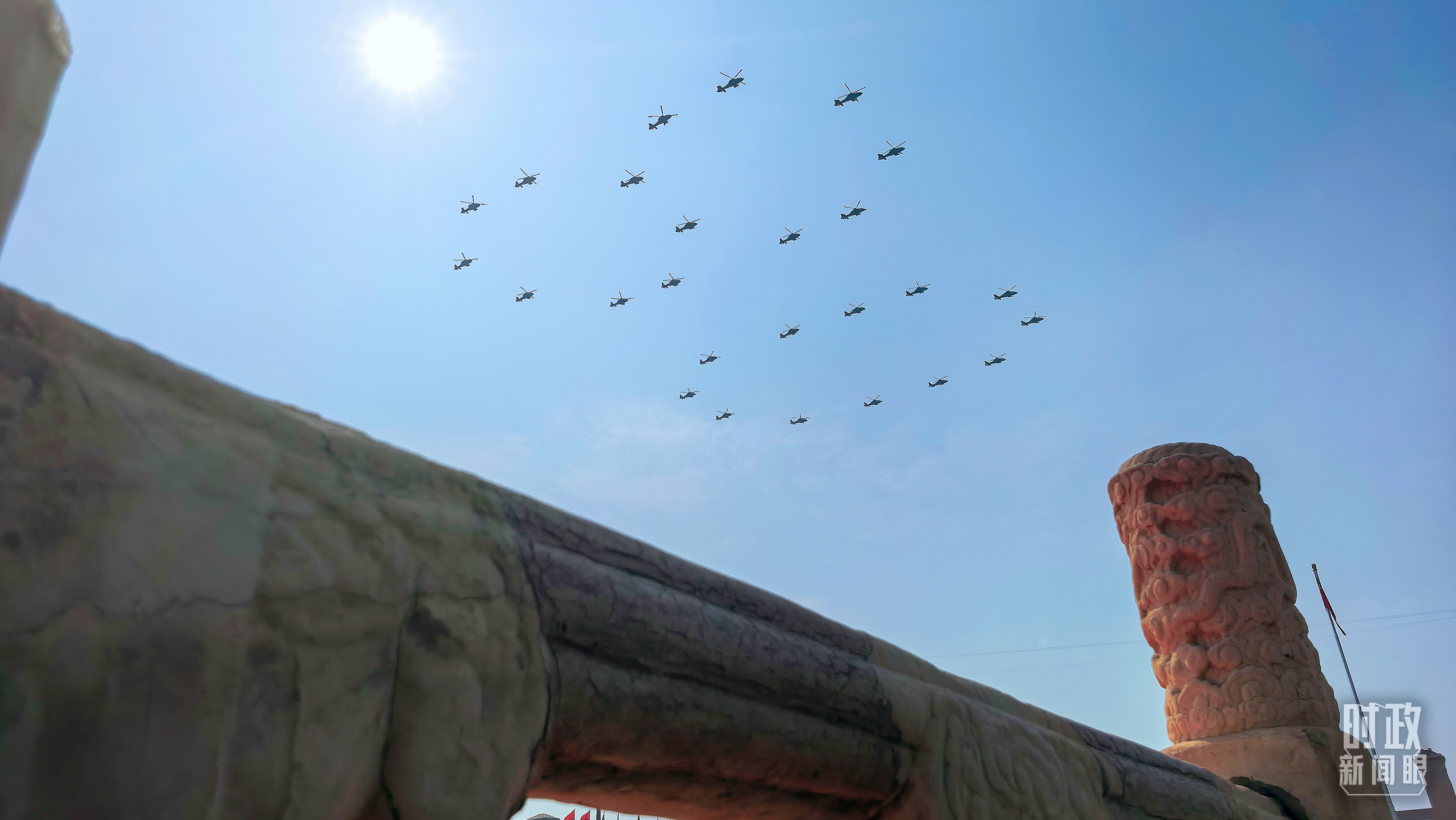 空中護旗梯隊率先亮相分列式環(huán)節(jié),26架直升機組成巨大的“80”字樣。教練機梯隊拉出14道彩煙,向中華民族14年可歌可泣的抗戰(zhàn)歷程致敬,向14億多中國人民奔向強國復(fù)興的不懈奮斗致敬。
