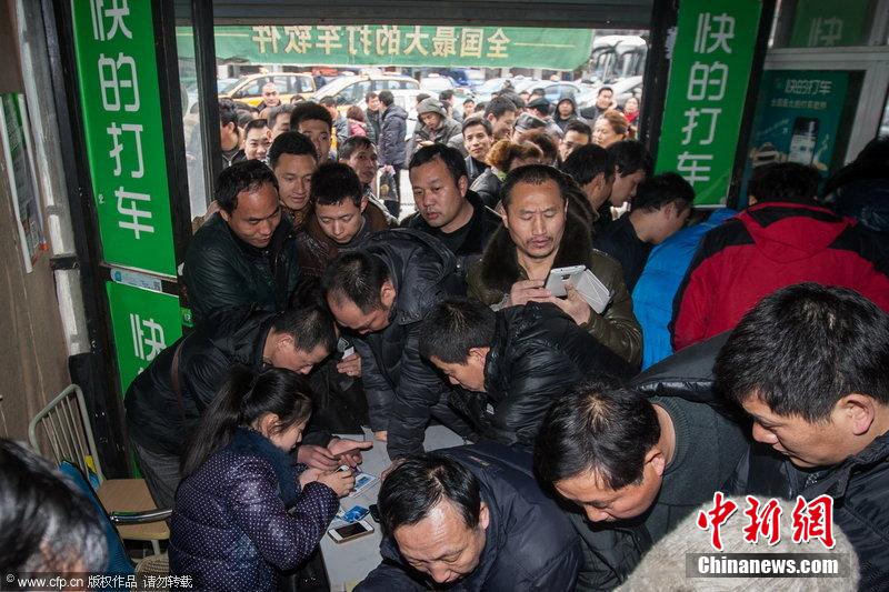 2014年2月19日,杭州,隨著“嘀嘀”、“快的”兩家打車軟件的“燒錢”競賽愈演愈烈,眾多出租車司機(jī)來到兩家打車軟件公司的杭州服務(wù)點(diǎn),排隊(duì)安裝司機(jī)版軟件。司機(jī)們表示,安裝打車軟件,一是為了緊跟潮流方便做生意,二是可以得到更多的“獎勵”補(bǔ)貼。