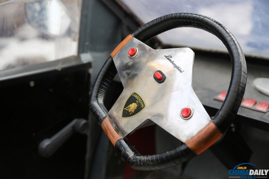方向盤中部按鈕控制車子的前進(jìn)、倒車。方向盤上的蘭博基尼標(biāo)志是老郭在網(wǎng)上購(gòu)買的。(侯建勛 攝)