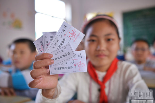 2013年10月16日,江蘇鎮(zhèn)江新區(qū)實(shí)驗(yàn)小學(xué)五年級(jí)(4)班的唐玥在展示她獲得的五張“作業(yè)免做券”。封疆江 攝 圖片來(lái)源:東方IC 版權(quán)作品 請(qǐng)勿轉(zhuǎn)載10月16日,江蘇鎮(zhèn)……