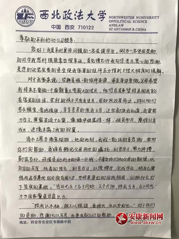 2016年11月24日一個(gè)平凡的日子里,一封從西北政法大學(xué)經(jīng)濟(jì)學(xué)院寄來的感謝信,“面對你們的幫助,我唯有銘記父母師長的囑托,刻苦學(xué)習(xí),努力拼搏,勤儉節(jié)約,珍惜資助到手的每一分錢,不辜負(fù)你們和父母的期望,以自信的態(tài)度,執(zhí)著的信念,刻苦學(xué)習(xí),以德博學(xué),完成學(xué)業(yè),把自己磨練成品學(xué)兼優(yōu)的合格有用人才,為將來更好的回報(bào)祖國,回報(bào)社會(huì)打下堅(jiān)實(shí)的基礎(chǔ)。”她叫王梅,出生于一個(gè)貧困家庭的大學(xué)生,家住陜西省平利縣洛河鎮(zhèn)線河村一組,父親身患?xì)埣,母親體弱多病,家庭生活僅靠父母務(wù)農(nóng)、打短工維系,家庭月收入不足千元,尚有患精神病的外婆需要贍養(yǎng)。
