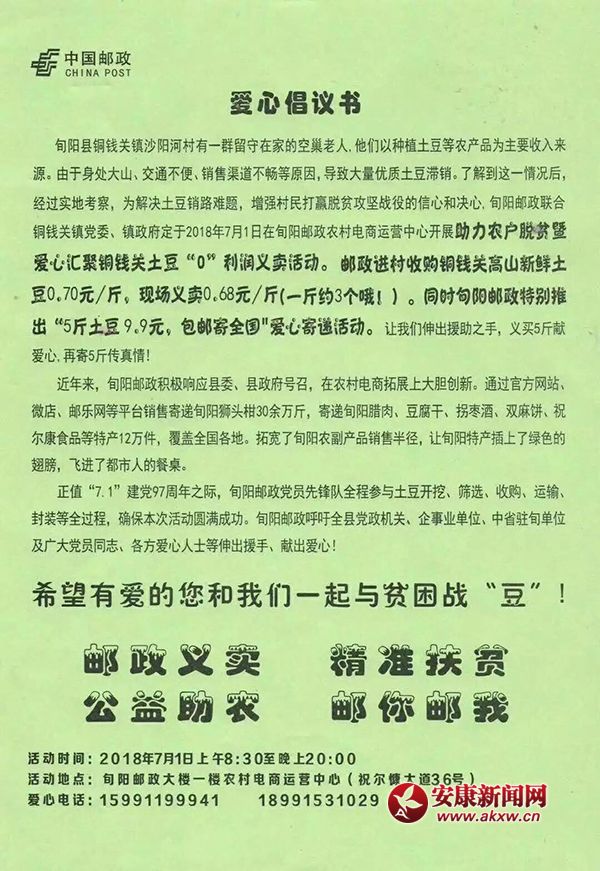 進村高價回收、線下低價義賣:旬陽郵政公司已經(jīng)與銅錢關(guān)鎮(zhèn)黨委、鎮(zhèn)政府對接聯(lián)合,赴沙陽河村收購高山新鮮土豆0.70元/斤,現(xiàn)場義賣0.68元/斤。對,你沒有看錯,真正的高價收購,低價義賣,只為貧困戶的勞動有尊嚴。定于2018年7月1日8點30分至晚上8點,在旬陽郵政大樓一樓農(nóng)村電商運營中心開展“助力農(nóng)戶脫貧暨愛心匯聚銅錢關(guān)土豆義賣活動”。