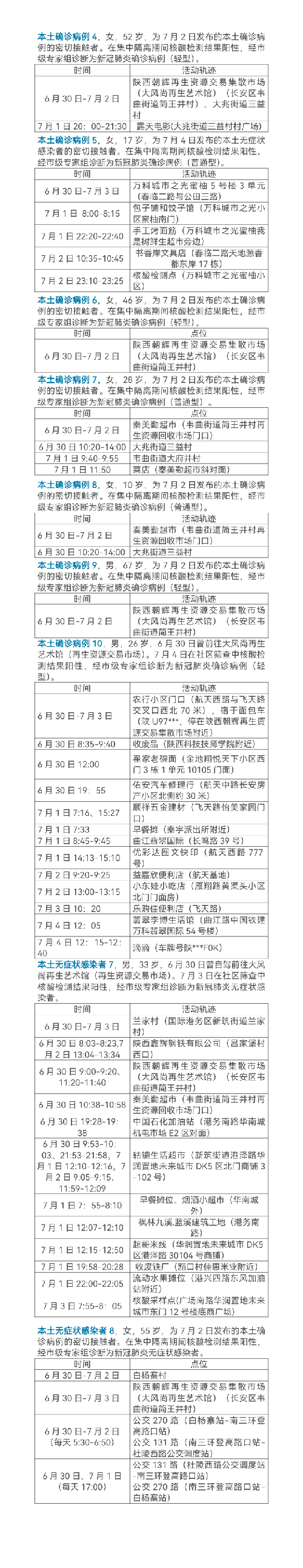 7月4日0-24時(shí),西安市新增7例本土確診病例,2例本土無(wú)癥狀感染者,7例在集中隔離中發(fā)現(xiàn),2例在社區(qū)篩查中發(fā)現(xiàn)。主要活動(dòng)軌跡如下: