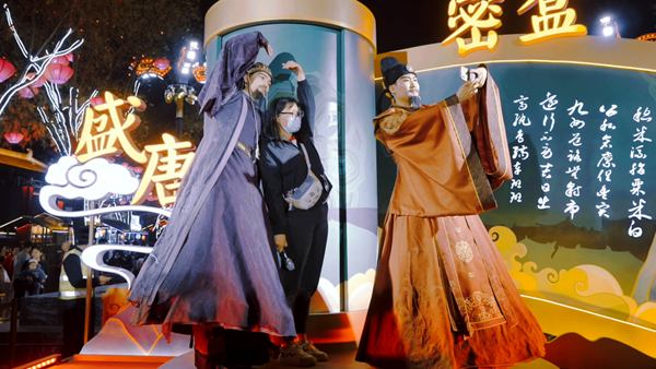 “《西游記》中九九八十一難,第一難是什么?”“不知道,不要緊,來,拍個照。”夜色漸濃,西安市大雁塔下的大唐不夜城華燈熠熠,流光溢彩。兩位身著古裝的演員,分別扮演唐代名人房玄齡和杜如晦,出題與游客進行互動,幽默風趣的提問和回答引得臺下觀眾不時發(fā)出陣陣歡笑。