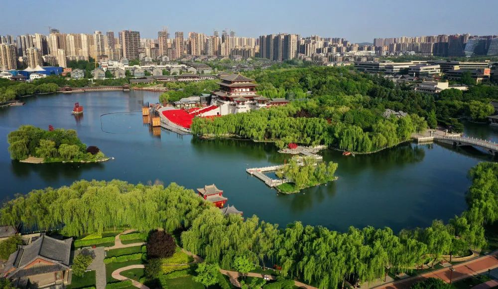 ↑西安曲江南湖(4月25日攝,無(wú)人機(jī)照片)。新華社記者 劉瀟 攝