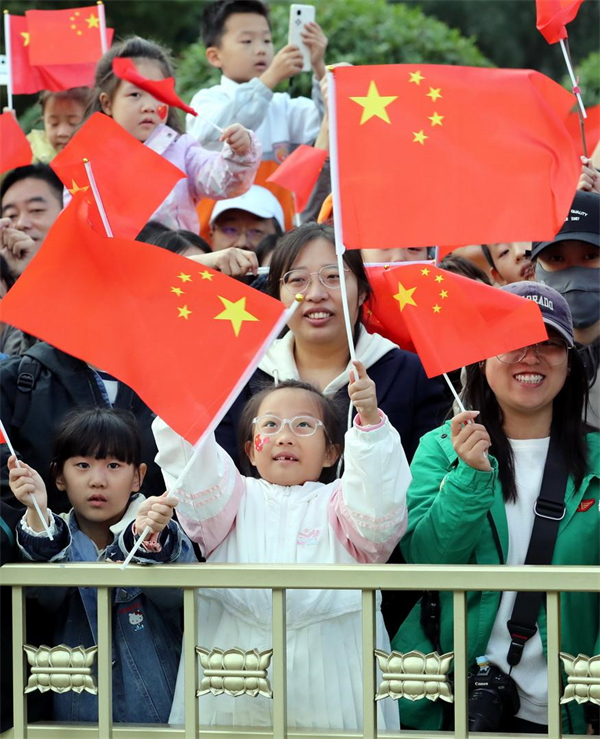 隨后,在《歌唱祖國(guó)》的奏樂(lè)中,人們揮舞著手中的國(guó)旗,盡情唱響愛(ài)國(guó)贊歌,表達(dá)愛(ài)國(guó)之情。