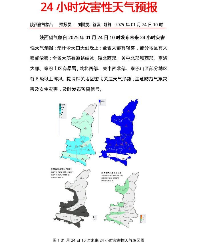 陜西省氣象臺(tái)2025年01月24日10時(shí)發(fā)布未來24小時(shí)災(zāi)害性天氣預(yù)報(bào):