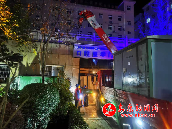 國網白河縣供電公司立即組織人員前往醫(yī)院查看故障情況,發(fā)現醫(yī)院專變的變壓器因高負荷燒毀,需要更換變壓器。下午7時,工作人員一邊幫助醫(yī)院協(xié)調轉運變壓器設備,一邊緊急調用一臺50千瓦的發(fā)電車,并迅速為醫(yī)院進行電源接入,第一時間為醫(yī)院的核酸檢測點、疫苗冷藏室、急診等優(yōu)先供電。