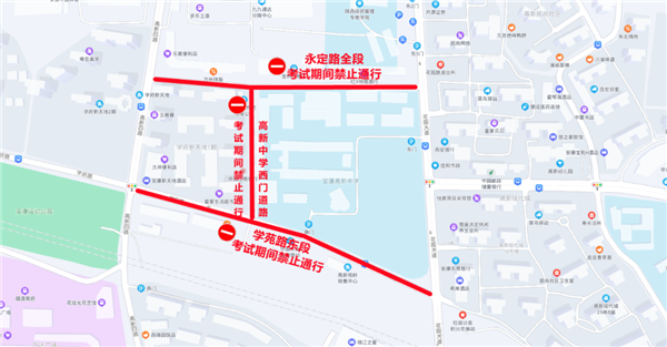 高新中學(xué)所處的學(xué)苑路東段、永定路全段、高新中學(xué)西側(cè)道路進(jìn)行交通管制,禁止所有車輛通行。