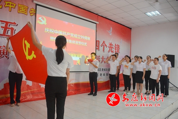 在領(lǐng)誓人的帶領(lǐng)下,街道新入黨的9名預(yù)備黨員握緊右拳,鏗鏘有力地宣讀入黨誓詞:“我志愿加入中國共產(chǎn)黨,擁護黨的綱領(lǐng),遵守黨的章程,履行黨員義務(wù),執(zhí)行黨的決定,嚴守黨的紀律,保守黨的秘密,對黨忠誠,積極工作,為共產(chǎn)主義奮斗終身,隨時準備為黨和人民犧牲一切,永不叛黨。”十二句話,句句千鈞,激勵著黨員們終身踐行入黨誓言,為黨的事業(yè)奮斗終身。