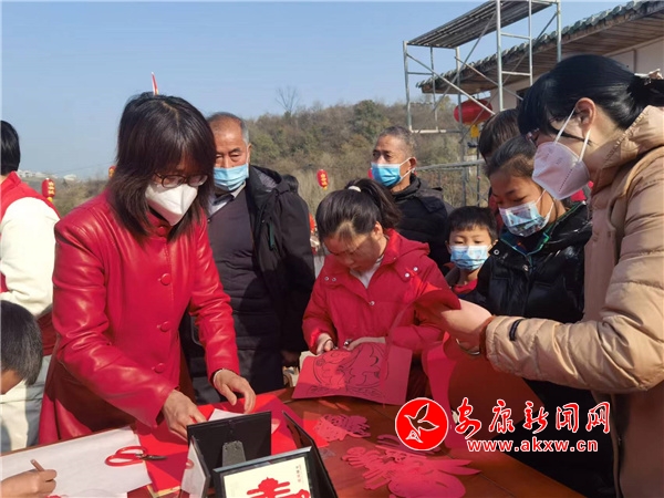 除了精彩的文藝表演,來(lái)自漢濱區(qū)文化館的駐村幫扶工作人員還組織了該館業(yè)務(wù)干部和非遺傳承人開(kāi)展寫春聯(lián)、剪窗花、玩社火、印版畫(huà)、包餃子等民俗活動(dòng),讓村民們流連忘返。書(shū)法家們揮毫潑墨,以書(shū)寫春聯(lián)和“福”字的方式為村民們送上新春祝福;窗花、版畫(huà)的互動(dòng)活動(dòng)也吸引了不少村民們的駐足圍觀,來(lái)自漢濱區(qū)文化館的文化志愿者們現(xiàn)場(chǎng)示范講解,一幅幅精美的作品在他們手中呈現(xiàn),有的還沒(méi)完工,就已被圍觀的村民們搶先預(yù)定……
