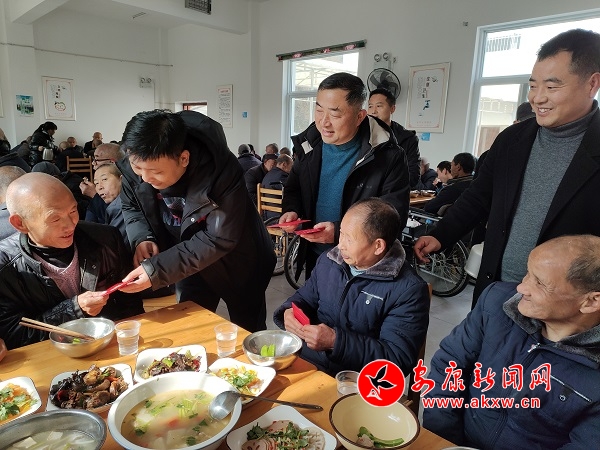 中午11點(diǎn),“客人”準(zhǔn)時(shí)而至。“大家新年好!給大家拜年了!一會(huì)兒咱們一起吃團(tuán)年飯!”早陽(yáng)鎮(zhèn)黨委書記金鑫和副鎮(zhèn)長(zhǎng)陳志恒剛走進(jìn)敬老院,就熱情地?fù)]著手和老人們打著招呼。走進(jìn)敬老院的餐廳,一股濃濃的香味撲面而來(lái),十張桌子上早已整齊地?cái)[放著豐盛的菜肴,紅苕蒸肉、紅燜肘子、紅燒雞塊、八寶飯、涼拌菠菜……紅的綠的擺滿整張桌子,讓人賞心悅目。