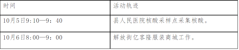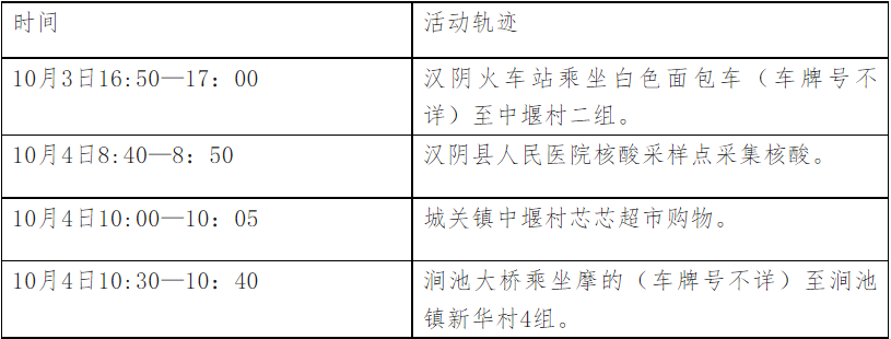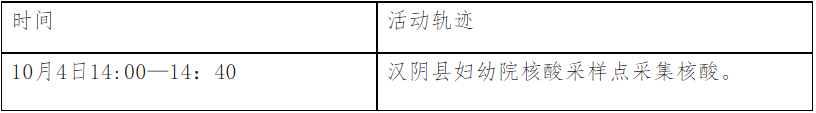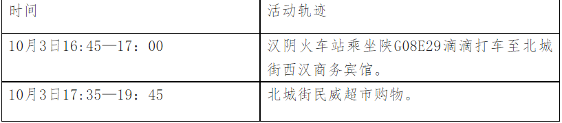 根據(jù)流調(diào)情況,現(xiàn)將漢中一例初篩陽性病例涉及密切接觸者在漢陰縣公共場所活動軌跡公布如下: