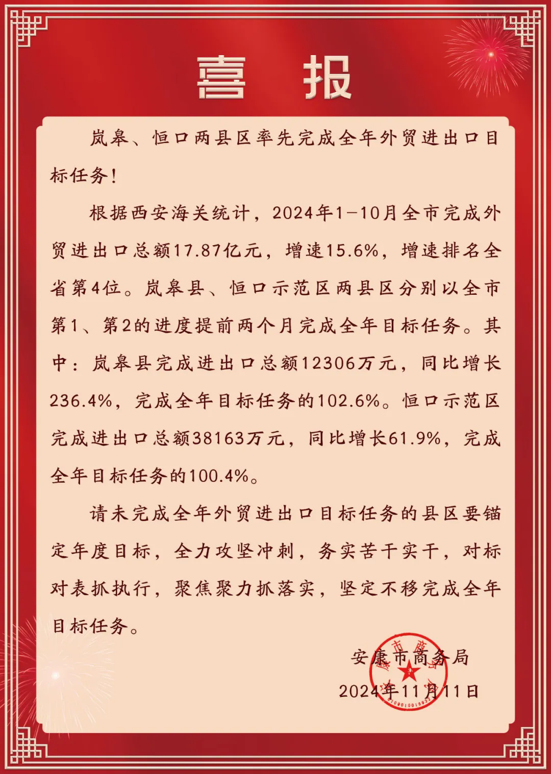 近日,市商務(wù)局發(fā)來喜報,恒口示范區(qū)率先完成全年外貿(mào)進出口目標任務(wù)。