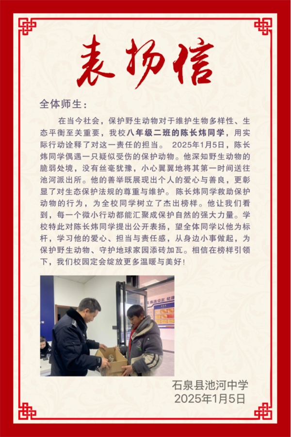 陳長煒的暖心事跡傳到學校后,學校發(fā)布了表揚信,公開表揚陳長煒同學的愛心善舉和保護野生動物的暖心行為。號召全體學生要學習陳長煒的愛心、責任和擔當,從小事做起,從自身做起,保護野生動植物,為保護地球家園、尊重生態(tài)文明的多樣性貢獻力量。
