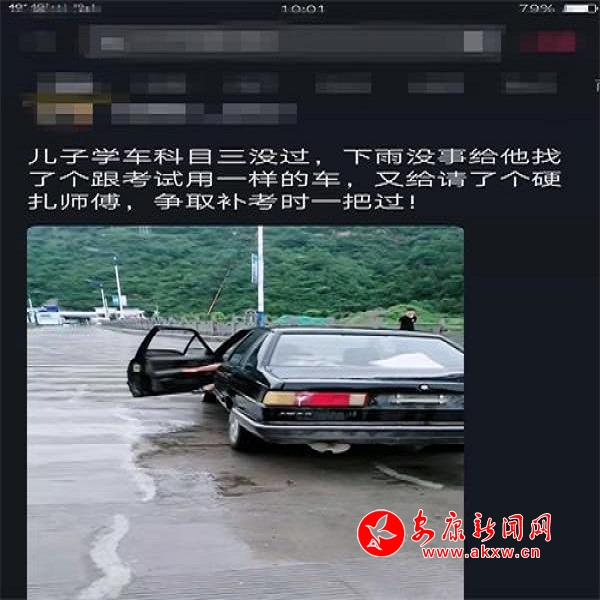 2019年7月17日,梁某某吃完中午飯后,想到其兒子去年考駕駛證科目三沒有過,今年暑假需要補(bǔ)考,又擔(dān)心過不了,就動(dòng)了小心思,何不提前找一個(gè)和考試車差不多的給他練練手,這樣考試成功的幾率會(huì)大些,便找來一輛黑色桑塔納交由兒子練習(xí),并發(fā)了一段抖音視頻:“兒子科目三沒過,下雨沒事給他找了個(gè)跟考試用一樣的車,又給請(qǐng)了個(gè)硬扎師傅,爭(zhēng)取考試時(shí)一把過”,旬陽(yáng)縣公安局交警大隊(duì)甘溪中隊(duì)民警根據(jù)視頻找到其練車地點(diǎn),對(duì)梁某某父子的違法行為進(jìn)行了現(xiàn)場(chǎng)批評(píng)教育,并將其傳喚到中隊(duì)接受調(diào)查,目前案件正在辦理中。