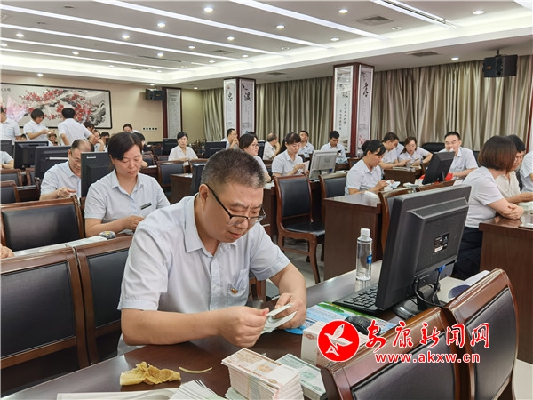 據(jù)了解,此次比賽設(shè)置了翻打百?gòu)垈髌、字符錄入和手工點(diǎn)鈔、業(yè)務(wù)知識(shí)競(jìng)賽四個(gè)項(xiàng)目。在翻打百?gòu)垈髌焙蜐h字錄入環(huán)節(jié),選手們靈巧的雙手在計(jì)算器和鍵盤(pán)上游走,伴隨著“噼里啪啦”敲擊聲,只見(jiàn)一個(gè)個(gè)數(shù)字答案輸入考試系統(tǒng),一行行字符在電腦屏幕上快速跳動(dòng)。在點(diǎn)鈔比賽中,選手們單指單張、多指多張等多種點(diǎn)鈔手法各顯風(fēng)采,清點(diǎn)、墩齊、扎把、蓋章,每個(gè)步驟都環(huán)環(huán)相扣,一絲不茍,嫻熟的手法讓人目不暇接,印象深刻。