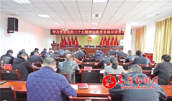 黨的二十大為新時代新征程黨和國家事業(yè)發(fā)展、實現(xiàn)第二個百年奮斗目標(biāo)擘畫了發(fā)展藍(lán)圖、規(guī)劃了實踐路徑、作出了戰(zhàn)略部署。旬陽市委第一時間召開會議、印發(fā)通知,要求全市各級黨組織和廣大黨員把學(xué)習(xí)宣傳貫徹黨的二十大精神作為當(dāng)前和今后一個時期的重大政治任務(wù),迅速興起學(xué)習(xí)熱潮。去年10月24日以來,市委先后召開6次會議集中學(xué)習(xí)黨的二十大精神,10月28日,全市黨員干部學(xué)習(xí)黨的二十大精神集中培訓(xùn)會順利召開,11月22日,旬陽市黨的二十大精神宣講工作全面啟動,市委書記陳紅星在城關(guān)鎮(zhèn)開展黨的二十大精神首場宣講,以上率下做好宣講“頭等大事”。市委書記的帶頭宣講宛如一聲“發(fā)令槍”,引領(lǐng)全市宣講不斷走深走實。隨后,其他市級領(lǐng)導(dǎo)、各鎮(zhèn)黨委書記和市直部門主要負(fù)責(zé)同志,均深入基層或在分管領(lǐng)域、本單位本系統(tǒng)開展宣講90余場次,切實推動黨的二十大精神進黨政機關(guān)、進企事業(yè)單位、進城鄉(xiāng)社區(qū)、進校園課堂、進各類新經(jīng)濟組織和新社會組織。