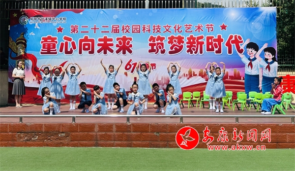 舞臺(tái)中央“童心向未來,筑夢(mèng)新時(shí)代”一行醒目的紅色標(biāo)題映入眼簾。少先隊(duì)員納新儀式上,黨員教師和輔導(dǎo)員老師共同為新入隊(duì)的孩子們佩戴上鮮艷的紅領(lǐng)巾,新隊(duì)員們?cè)诖箨?duì)輔導(dǎo)員的帶領(lǐng)下莊嚴(yán)地宣誓。各班、各社團(tuán)精心編排的文藝節(jié)目依次上演,精彩的節(jié)目引起陣陣歡呼,掌聲響成一片。隨后,還組織了學(xué)生書畫和科技小制作展覽,大家不時(shí)駐足觀看,燦爛的笑容匯成校園里一道亮麗的風(fēng)景。