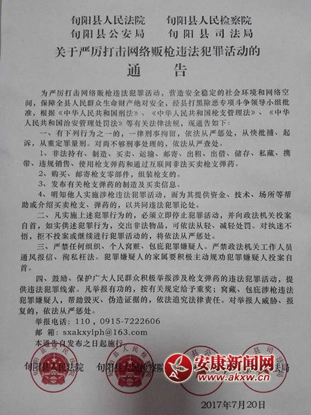 安康新聞網(wǎng)訊(通訊員 祝康)7月20日,旬陽警方聯(lián)合法、檢、司部門共同發(fā)布了《關(guān)于嚴(yán)厲打擊網(wǎng)絡(luò)販槍違法犯罪活動(dòng)的通告》。從該縣警方了解到,發(fā)布此次《通告》……