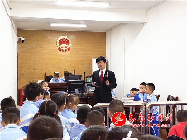 在參觀過程中,干警帶領(lǐng)同學(xué)們走進(jìn)訴訟服務(wù)中心和干警辦公室了解了法院干警的工作場所。隨后,帶領(lǐng)同學(xué)們參觀審判庭,現(xiàn)場向同學(xué)們介紹科技審判法庭的功能及庭審流程,并展示了法袍、法槌和法徽,同時(shí)用深入淺出的語言和提問互動(dòng)的方式向孩子們講解了法袍、法槌和法徽的象征意義,同學(xué)們興趣濃厚,紛紛走上審判臺,親身感受和觸摸審判設(shè)施,感受法庭審判的嚴(yán)肅和莊重。