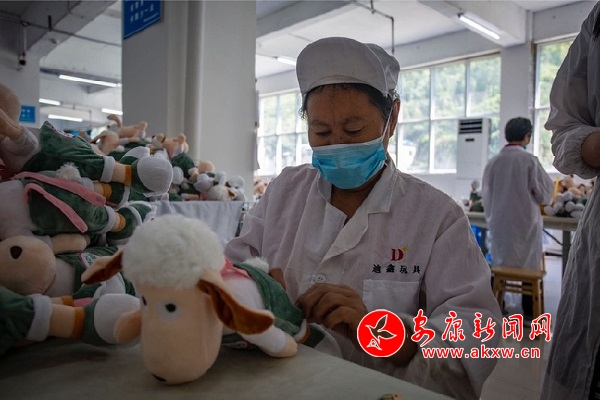 在毛壩鎮(zhèn),像杜孝彩一樣在家門口上班的人還有很多,這是怎么一回事兒呢?原來這都得益于社區(qū)玩具工廠。當天紫陽走訪的第一站,記者就來到迪鑫玩具工廠,縫紉車間、手工車間……車間里的工人都是當?shù)卮迕瘢麄儖故斓夭僮,一件件毛絨玩具在這里生產(chǎn)出來,銷往全球。