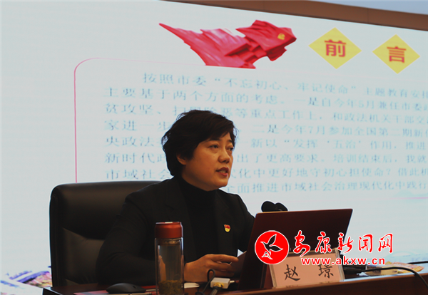 本網(wǎng)訊 11月1日,市委副書記、政法委書記趙璟以“推進(jìn)‘五治’融合,打造善治安康”為題,為政法委系統(tǒng)干部講授“不忘初心、牢記使命”主題教育專題黨課。