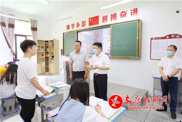 在漢濱高中, 寇全安一行先后檢查了入校檢測(cè)點(diǎn)、防疫物資儲(chǔ)備、監(jiān)控平臺(tái)運(yùn)行等,了解考點(diǎn)參考人數(shù)、考場(chǎng)布置,以及食品安全、試卷保密等備考保障措施落實(shí)情況,叮囑要壓實(shí)各方責(zé)任,加強(qiáng)統(tǒng)籌配合,為廣大考生營(yíng)造安全安靜、舒適舒心的考試環(huán)境。在江北高中和漢陰縣第二中學(xué),他走進(jìn)教室和高考學(xué)子交談,勉勵(lì)他們保持良好心態(tài),從容備考應(yīng)考,并祝福考生取得優(yōu)異成績(jī);還著重了解了學(xué)校心理咨詢室運(yùn)行情況,并就如何開展心理健康教育和預(yù)防校園暴力與校長(zhǎng)、部分教師進(jìn)行了交流探討。
