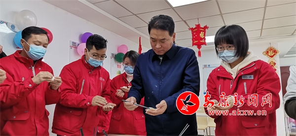 隨后,趙俊民來到項(xiàng)目部職工食堂,與大家一起包餃子吃團(tuán)年飯,其樂融融迎新年。