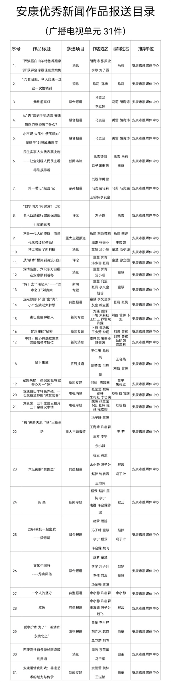 根據(jù)《關(guān)于開(kāi)展2024年度安康優(yōu)秀新聞作品、安康市優(yōu)秀新聞工作者推選工作的通知》(安記協(xié)〔2025〕04號(hào))文件要求,經(jīng)推薦、領(lǐng)導(dǎo)審核,安康市融媒體中心推薦參評(píng)2024年度安康優(yōu)秀新聞作品97件(報(bào)紙單元58件,廣播電視單元31件,新媒體單元8件)。現(xiàn)將報(bào)送作品目錄(詳見(jiàn)附件)予以公示。