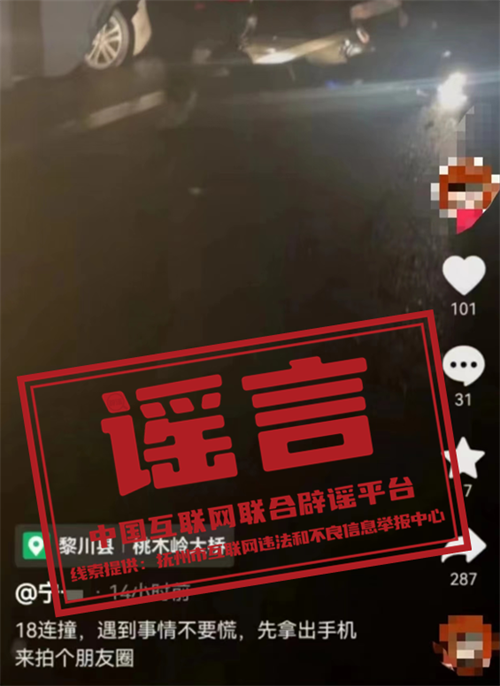 真相:近日,有網(wǎng)民在某網(wǎng)絡(luò)平臺發(fā)布“江西黎川境內(nèi)福銀高速贛閩交界處發(fā)生一起18車連撞重大交通事故”的視頻。經(jīng)向?qū)俚馗咚俳痪藢,黎川高速路段并未發(fā)生18車連撞事故,該視頻信息系謠言。目前,警方已依法對散布網(wǎng)絡(luò)謠言視頻者予以行政處罰,并責(zé)令其刪除相關(guān)不實視頻。(來源:“撫州網(wǎng)警”微信公眾號)