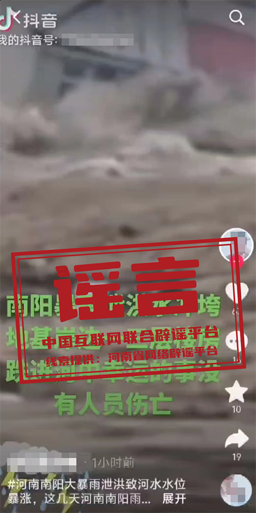 7月15日,網(wǎng)民“憶思xx”在某短視頻平臺(tái)發(fā)布視頻稱“南陽(yáng)暴雨泄洪,水沖垮地基,岸邊一三層樓房跌進(jìn)河中,幸運(yùn)的是沒(méi)有人員傷亡”。經(jīng)核實(shí),南陽(yáng)此次暴雨未發(fā)生房屋被沖塌事件,該視頻為2021年某地暴雨泄洪,致河水水位上漲,岸邊3層樓房轟然倒塌視頻,并非近日發(fā)生的汛情。