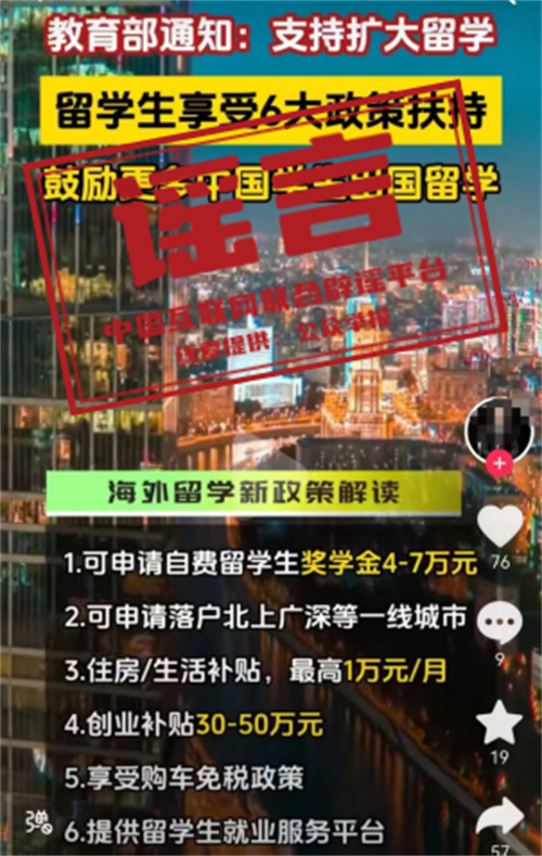 詳情:近日,有自媒體在多個(gè)網(wǎng)絡(luò)平臺(tái)發(fā)布視頻,稱(chēng)“教育部留學(xué)中心召開(kāi)發(fā)布會(huì)宣布‘將擴(kuò)大支持留學(xué),留學(xué)生將享受申請(qǐng)自費(fèi)留學(xué)獎(jiǎng)學(xué)金、申請(qǐng)落戶(hù)一線城市等六大政策扶持’等留學(xué)新政策”。對(duì)此,教育部留學(xué)服務(wù)中心7月29日鄭重聲明:該視頻虛假不實(shí),我中心從未召開(kāi)此發(fā)布會(huì),從未發(fā)布過(guò)相關(guān)政策。所謂六大政策支持,主要是對(duì)部分地方有關(guān)政策的拼湊和夸大。請(qǐng)廣大留學(xué)生及公眾提高警惕,謹(jǐn)防上當(dāng)受騙。對(duì)此類(lèi)造謠炒作行為,我中心保留追究相關(guān)方法律責(zé)任的權(quán)利。(來(lái)源:“教育部留學(xué)服務(wù)中心”微信公眾號(hào))