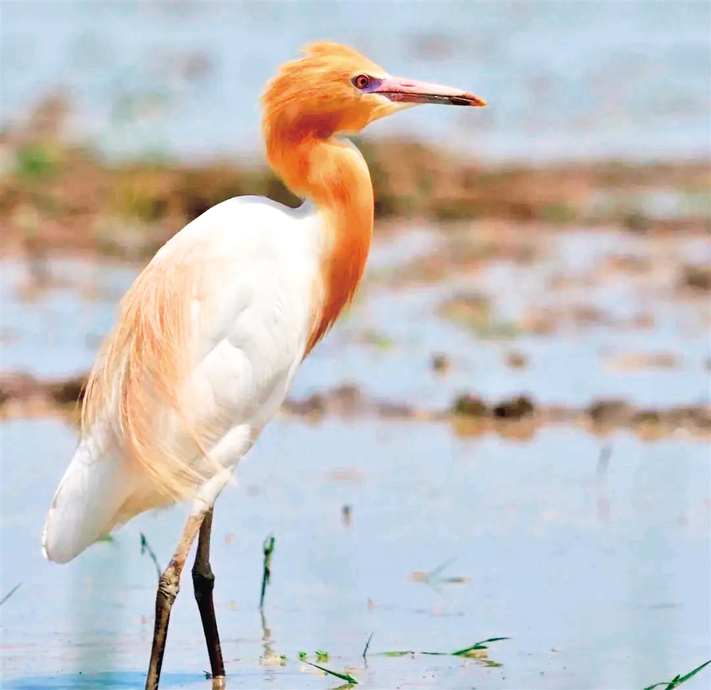 夏羽大都白色;頭和頸橙黃色,前頸基部和背中央具羽枝分散成發(fā)狀的橙黃色長形飾羽;前頸飾羽長達胸部,背部飾羽向后長達尾部,尾和其余體羽白色。冬羽通體全白色,個別頭頂綴有黃色,無發(fā)絲狀飾羽。橙黃色的喙長、尖而直,較側扁、尖端多有小鋸齒;翅較寬長,前頸的基部和背部中央具有羽枝分散成發(fā)狀的橙黃色長飾羽、前頸的飾羽長達胸部,背部的飾羽向后長達尾部。牛背鷺喜歡站在牛背上或跟隨在耕田的牛后面啄食翻出來的昆蟲和牛背上的寄生蟲等,因此得名。(來源:安康市林學會)n3p安康新聞網