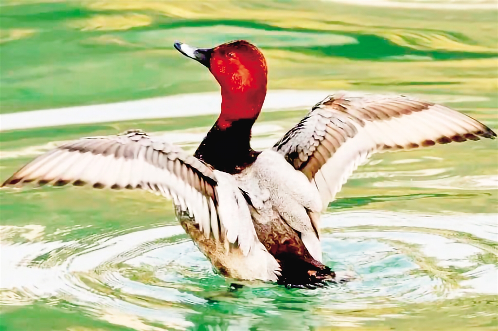 又名紅頭鴨,磯鳧。雄鳥頭部栗紅色,胸部黑色,背部及腹部灰白色,尾黑色,嘴藍(lán)灰色且端部黑色;雌鳥頭部及胸部暗褐色,背部及腹部灰色,尾部褐色,嘴基部色淺。紅頭潛鴨虹膜雄鳥紅色,雌鳥灰褐色,腳黑色。(來源:安康市林學(xué)會(huì))FSQ安康新聞網(wǎng)