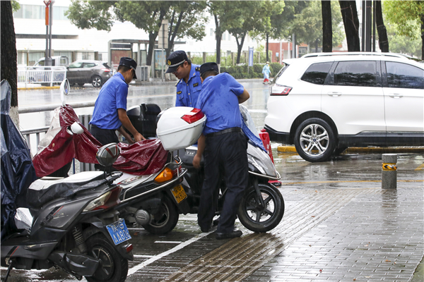 2022年7月19日,漢濱城管分局新城執(zhí)法大隊的執(zhí)法人員,冒著小到中雨,沿著巴山東路清理整頓占道經(jīng)營和亂停亂放等不良行為。(李元武)ej3安康新聞網(wǎng)