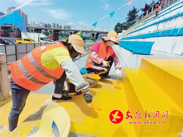 5月30日,工人們?cè)诘诙膶冒部禎h江龍舟節(jié)主會(huì)場(chǎng)進(jìn)行地面第二輪刷漆。據(jù)市市政園林處現(xiàn)場(chǎng)負(fù)責(zé)人介紹,截至目前,已搭建隔離護(hù)欄3715米,建立安檢門(mén)及疏散通道18個(gè)、蛇形通道8個(gè),制作安裝導(dǎo)視牌10塊,對(duì)看臺(tái)區(qū)立面刷漆2629平方米,擦拭清洗并固定座椅3794個(gè)。錢(qián)運(yùn)立 攝