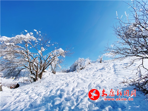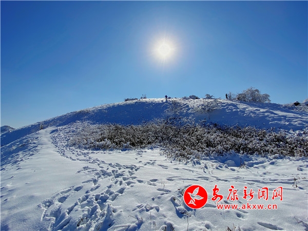 陽光透過樹縫,灑向白茫茫的草甸,萬物潔凈如新。站在草甸之上,環(huán)顧四周,美景盡收眼底,山舞銀蛇襯之藍(lán)天雪地,讓人嘆為觀止。