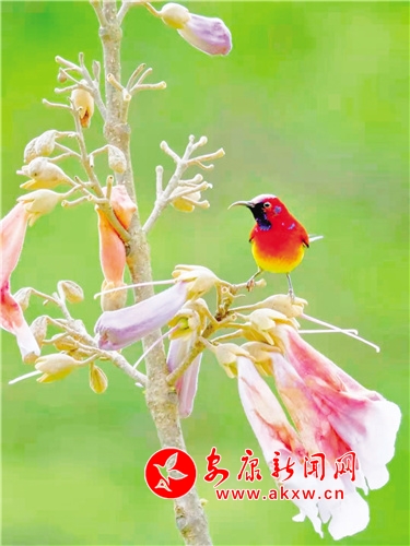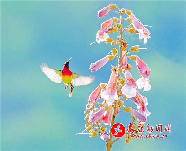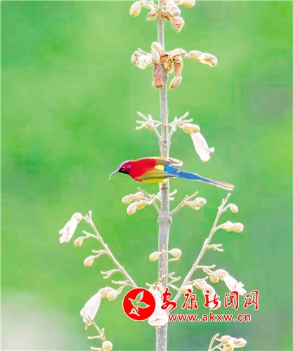 桐花鳳,是經(jīng)常出現(xiàn)在古代文人墨客筆下的吉祥鳥。但因很多人從未見過桐花鳳,遂將桐花鳳與綠毛幺鳳等混淆起來。經(jīng)今人翔實(shí)考證,才證實(shí)古“桐花鳳”就是現(xiàn)今的“太陽(yáng)鳥”。太陽(yáng)鳥象征著祥瑞、吉祥和諧、鳳凰齊飛、太陽(yáng)重升、身化火焰而使人間恢復(fù)光明。它還是熱愛光明、追求光明、獻(xiàn)身光明的象征。太陽(yáng)鳥也是太陽(yáng)崇拜和鳥崇拜相結(jié)合的產(chǎn)物。太陽(yáng)鳥世界共有14種,中國(guó)有6種,被譽(yù)為“東方的蜂鳥”“月下老人”,再加上太陽(yáng)鳥的寓意如此之好,太陽(yáng)鳥一直受到人們的喜愛與青睞。(圖文 張東風(fēng) )